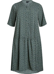 Midikjole med korte ærmer og rund halsudskæring med en lille v-slids foran samt en kort knaplukning med stofbetrukne knapper. Modellen har en skæring i taljen, der skaber en flot a-facon og et høj-lav-design, hvor den er kortere foran og længere bagtil. Kjolen er lavet i et let materiale med 55 % genanvendt polyester.
