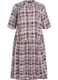 Midikjole med korte ærmer og rund halsudskæring med en lille v-slids foran samt en kort knaplukning med stofbetrukne knapper. Modellen har en skæring i taljen, der skaber en flot a-facon og et høj-lav-design, hvor den er kortere foran og længere bagtil. Kjolen er lavet i et let materiale med 55 % genanvendt polyester.