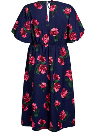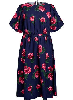 Feminin midikjole med et smukt rosentryk, rund hals med åbning og bindebånd i nakken samt korte ballonærmer med indvendig lining, som giver en voluminøs effekt. Kjolen har elastik i taljen, som skaber en feminin silhuet og lader det rynkede skørt falde flot om kroppen. Denne kjole indeholder 92 % LENZING™ ECOVERO™ Viskose-fibre, som tilfører naturlig blødhed og fald.