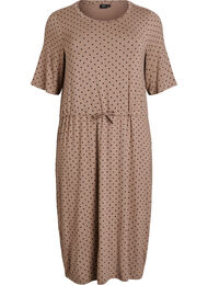 Blød og komfortabel jerseykjole i en strækbar viskosekvalitet med all-over print. Kjolen er midilang og har korte ærmer, rund halsudskæring og en regulær pasform med fastsyet bindebånd i taljen. Denne kjole indeholder 95% LENZING™ ECOVERO™ Viskose-fibre, som tilfører naturlig blødhed og fald.