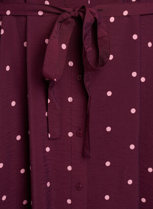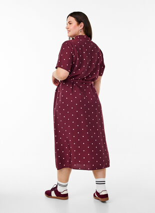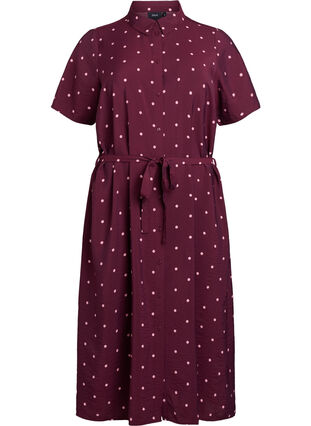 Midilang skjortekjole i en lækker viskosekvalitet med 83% LIVAECO™ Viskose og et fint prikket mønster. Kjolen har korte ærmer, klassisk skjortekrave, gennemgående knaplukning og en regulær pasform med et aftageligt bindebånd i taljen.