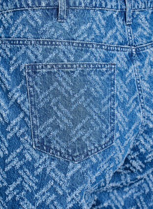 Højtaljede mom fit jeans i 100% bomuld med et ton-i-ton strukturmønster og en vasket, let slidt effekt. Disse jeans har klassiske bæltestropper, for- og baglommer samt indvendig, justerbar elastikbånd i taljen, hvilket gør det nemt at tilpasse pasformen. Modellen er rummelig ved hofter og lår og bliver gradvist smallere ved anklerne.