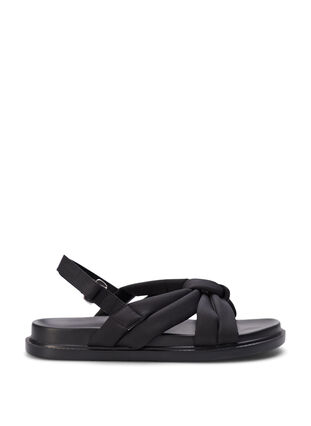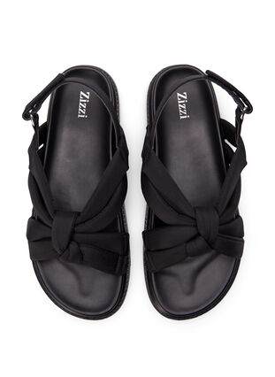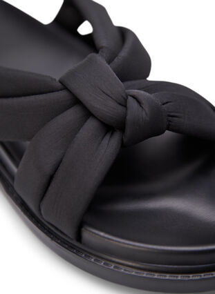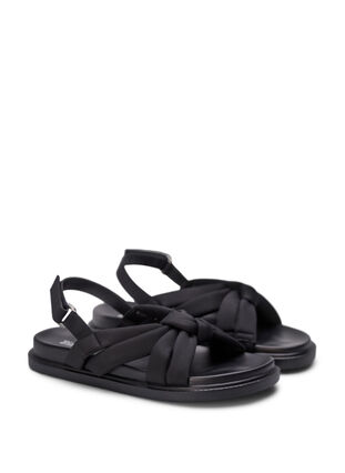 Sandal med knude detalje og bred pasform. Sandalen er designet med velcrolukning på hæl og elastiske paneler på indersiden, som sikrer en fleksibel pasform, der tilpasser sig din fod for optimal komfort og støtte.