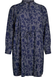 Skjortekjole med klassisk krave, gennemgående knaplukning og en længde, der går til lige under knæet. Modellen har lange ærmer med manchet og knapper samt et fastsyet bindebånd, der giver mulighed for at tilpasse pasformen og fremhæve taljen. Denne kjole indeholder 92% LENZING™ ECOVERO™ Viskose-fibre, som tilfører naturlig blødhed og fald.