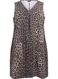 Knælang spencerkjole i denimkvalitet af bomuld med leopardprint. Kjolen har V-udskæring, store frontlommer og en afslappet pasform. Perfekt over en T-shirt eller langærmet top for et cool lag-på-lag look.