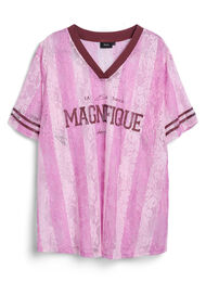 Trendy bluse med sporty referencer og et feminint twist. Modellen er lavet i et stribet blondestof med transparent effekt, som giver et let og luftigt udtryk. Blusen har korte ærmer, V-udskæring og kontrastdetaljer ved hals og ærmekanter. Foran har blusen et dekorativt statementprint, der tilfører et cool og afslappet look og gør blusen oplagt til lag-på-lag styling.