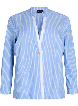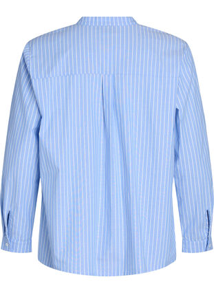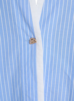 Stribet skjorte i 100% bomuld med en lille, opretstående krave, dyb V-udskæring med kontrastkant og dekorativ guldfarvet lukning foran. De lange ærmer afsluttes med manchet og knap, mens en bred læg bagpå giver ekstra rummelighed, flot fald og en løs, behagelig pasform.