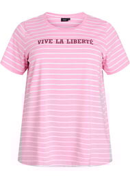 T-shirt i en blød og strækbar bomuldsblanding med regulær pasform. T-shirten har korte ærmer, rund hals og et stribet design med et trykt statement foran.