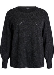 Feminin strikbluse med et fint hulmønster i diamantform på både front og ærmer, som tilfører et dekorativt og elegant udtryk. Blusen har en regulær pasform, rund hals og høj ribkant på ærmerne, der skaber en flot ballon-effekt. Den er fremstillet i et blødt materialemix med 94% genanvendt polyester.
