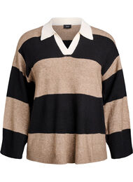 Casual strikbluse i et blødt og let materiale med 64% genanvendte fibre og 6% uld, som giver en lun og behagelig fornemmelse. Modellen har en klassisk krave med V-udskæring, lange ærmer og en løs pasform med ribkanter på ærmer og bund.