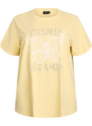 T-shirt i 100% økologisk bomuld med løs pasform. T-shirten har rund hals, korte ærmer og et stort frontprint med sommerfuglemotiv og dekorativ tekst med rhinsten.