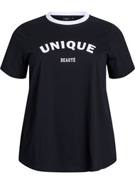 Casual t-shirt i 100% bomuld med rund hals og regulær pasform. T-shirten har et tekstprint på brystet og en kontrastfarvet halskant, der tilføjer et sporty twist til det enkle design.