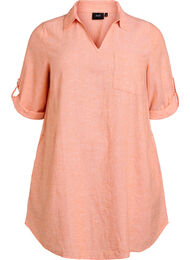Tunika med krave og V-hals, brystlomme, korte ærmer med opsmøg og lommer i siden. Tunikaen har en løs og komfortabel A-form og er fremstillet i en blød og åndbar hør- og viskoseblanding med let tekstur, som gør den behagelig og ideel til varme dage.
