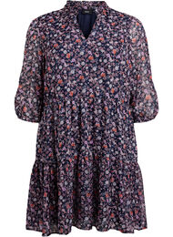 Tunika i et let materiale med et feminint blomsterprint og diskrete glittertråde. Modellen har en rund hals med flæsekrave og v-snit samt en inderlining, der sikrer optimal komfort. Tunikaen har let transparente 3/4-ærmer med elastikkant og en A-formet silhuet med skæringer, som skaber et blødt fald og et feminint udtryk.
