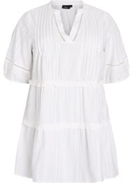 Tunika i 100 % bomuld med let tekstur og en A-facon med flæsedetalje i skæringerne. Modellen har V-udskæring og korte ærmer med elastikkant. Tunikaen er designet med fine, syede læg foran og blondebånd langs udskæringen og på ærmerne.