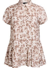 Tunika i blødt, let materiale med leopardprint i afdæmpede beige- og bruntoner. Tunikaen har en klassisk skjortekrave, kort stolpelukning med stofbetrukne knapper, korte ærmer og en løs A-facon med bred flæsekant forneden. Denne tunika indeholder 85% LENZING™ ECOVERO™ Viskose-fibre, som tilfører naturlig blødhed og fald.