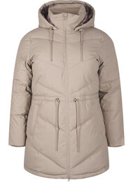 Mellemlang puffer vinterjakke med diagonale stikninger, fremstillet i vandafvisende materiale med gummilook og varm polstring. Jakken har hætte med justerbare snore, lommer i siden og ribmanchet i ærmet, som forhindrer kold luft i at trænge ind. Jakken lukkes med en vandtæt tovejs lynlås foran og har justerbare snore i taljen, som giver mulighed for at tilpasse pasformen.