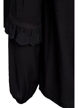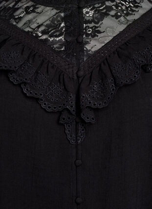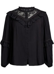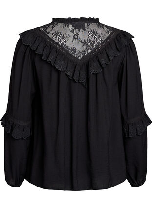Elegant bluse i en let og struktureret viskosekvalitet med feminine detaljer. Modellen har lange ærmer med elastikafslutning og dekorativ flæsekant. Ryggen er designet med blondestykke i en v-form, som prydes af en bred flæsekant med broderet mønster. Blusen har en løs a-shape, som falder flot og har små stofbetrukne knapper fortil.