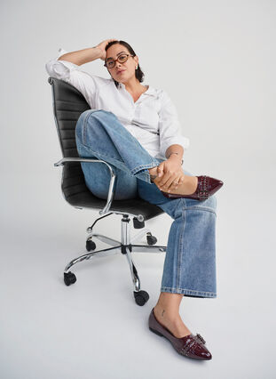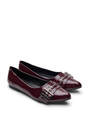 Stilfuld ballerina med spids tå og bred rem med dekorative nitter. Skoen er fremstillet i imiteret læder med skinnende laklook og designet til brede fødder. Den indvendige sål har ekstra støtte i svang og hæl, hvilket sikrer optimal komfort hele dagen.