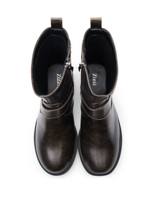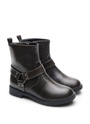 Cool bikerstøvle med et råt udtryk og dekorative detaljer. Modellen er designet i imiteret læder med en markant O-ring og brede remme med små nitter omkring anklen. Støvlen har kort skaft med ekstra vidde, rund snude, solid ydersål med skridhæmmende mønster og praktisk lynlås i siden, der gør den nem at få af og på.