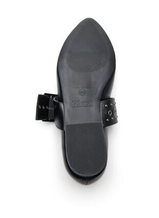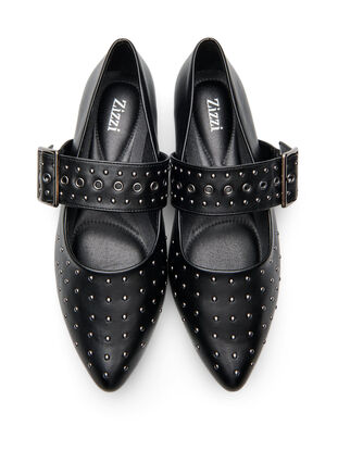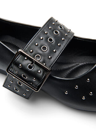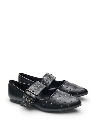 Stilfulde ballerinaer i blødt kunstlæder, designet til brede fødder med ekstra plads og komfort. Skoene har en spids tå og er dekoreret med små nitter, som er fordelt på overdelen og den brede, justerbare rem over foden. Den komfortable indersål giver ekstra støtte i svang og hæl for god affjedring og komfort hele dagen.