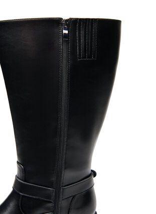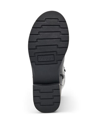 Cool høj støvle i 100% læder med ekstra vidde i skaftet. Modellen har en markeret ringdetalje med rem og spænder, som understreger det bikerinspirerede look. Den er nem at tage af og på takket være lynlås i indersiden og har elastik i skaftet for en bedre pasform. Indersålen giver plads til egne indlæg, og ydersålen har et skridhæmmende mønster, der sikrer godt fodfæste. En støvle med både stil og funktion, som passer perfekt til både kjoler og jeans.