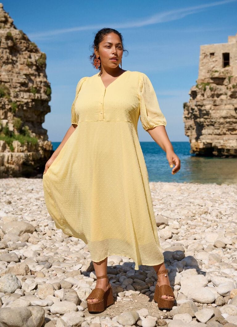 Kig generelt efter kjoler med interessante detaljer omkring skuldre og halsudskæring – fx en smuk udskæring, mønstre, små flæser eller pyntede ærmer, som trækker blikket opad og skaber fokus omkring ansigt og overkrop.
